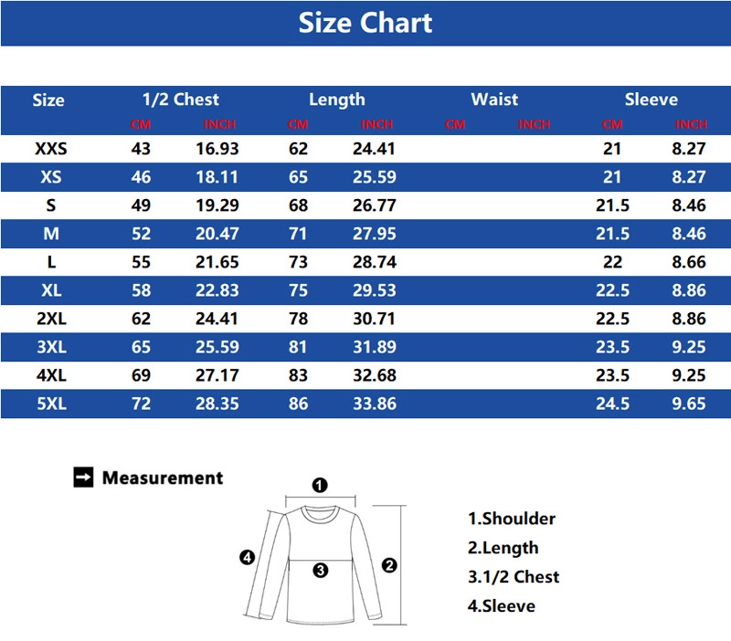 • Sizes: Regular sizes XS to 5XL available, any other special sizes can be customized