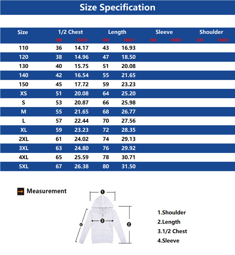 • Sizes: Regular sizes XS to 5XL for adult sizes, 110-150 for kids available, any other special sizes can be customized